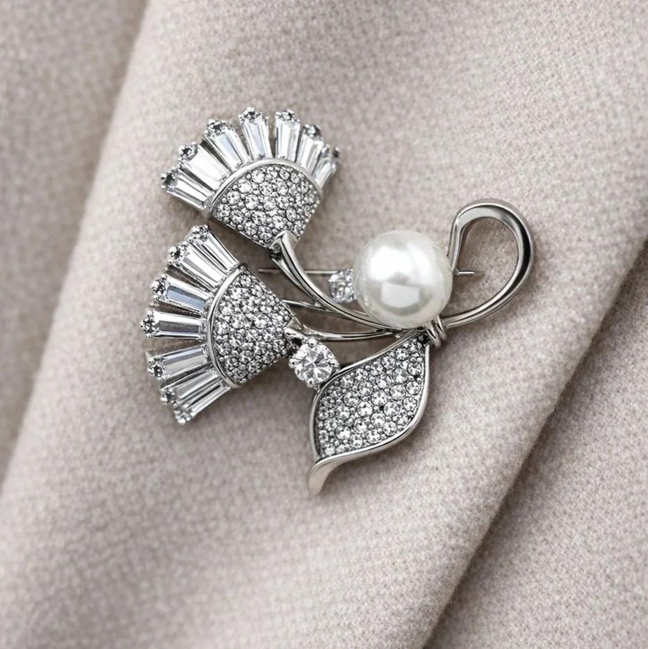 گل سینه زنانه ژوپینگ مدل مرواریا طرح مروارید جواهری نگیندار نقرهای