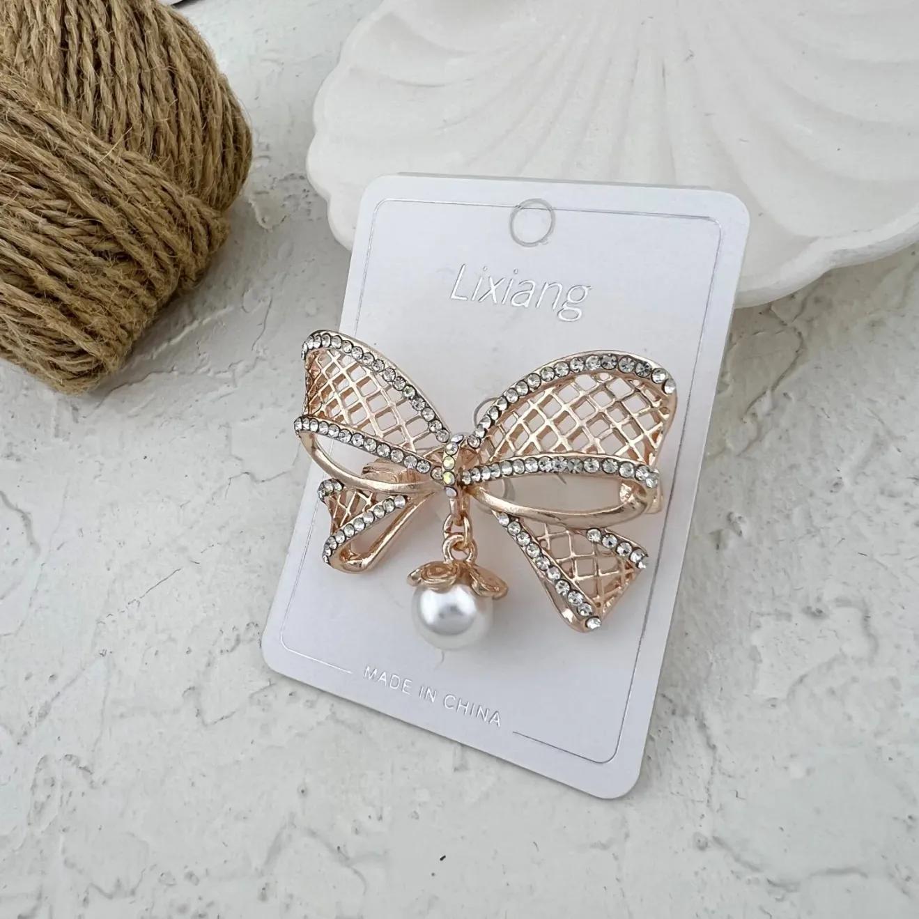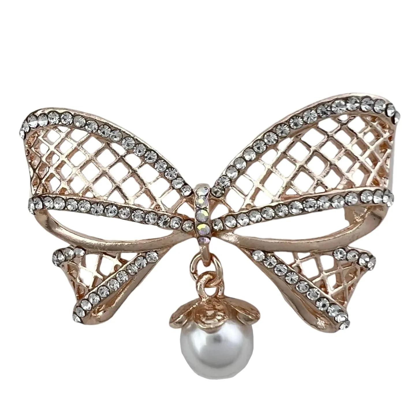 Women's Bow Brooch with Rhinestones and Pearl Pendant