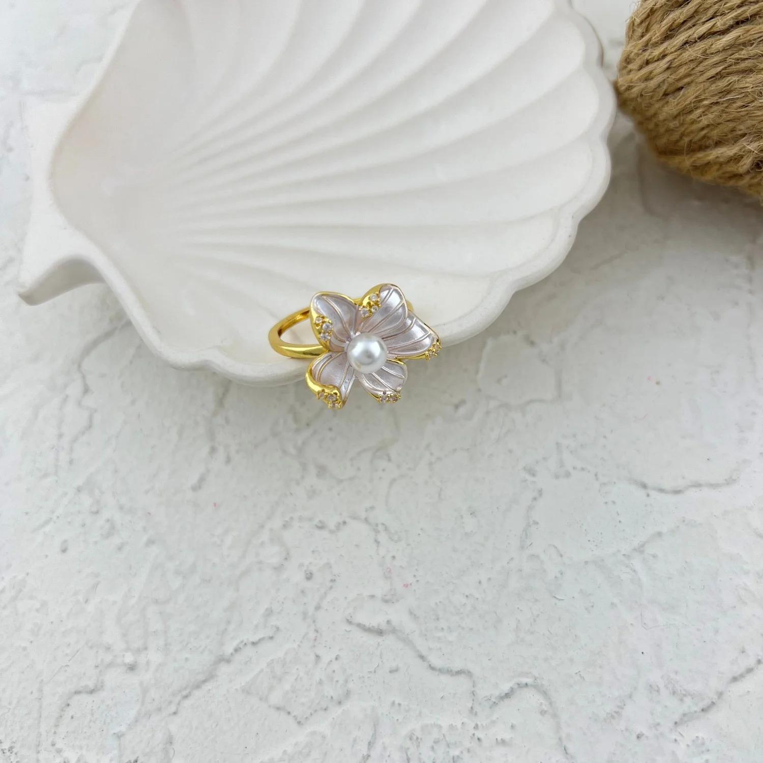 Women's Ring with Colorful Enamel Flower and Delicate Pearl Design