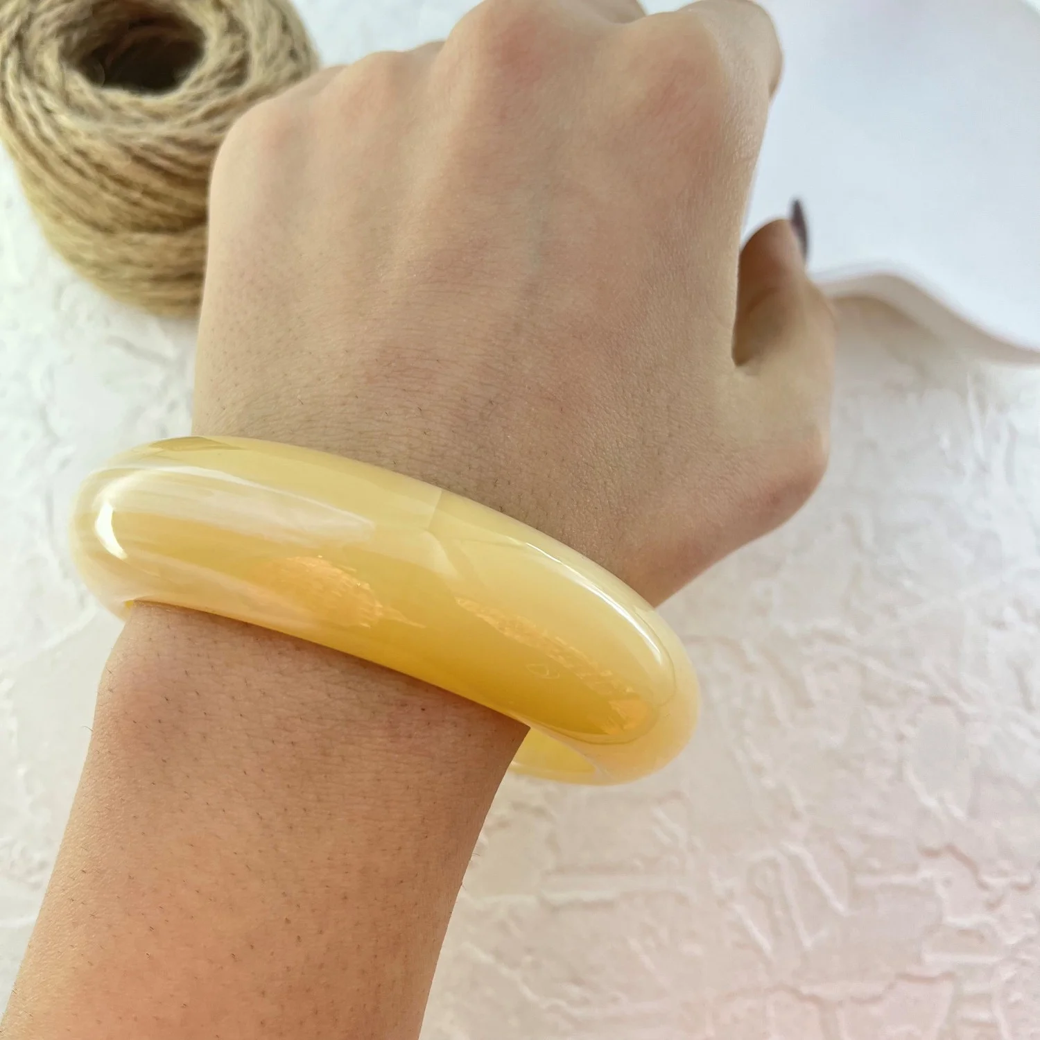 دستبند بنگل رزینی با طراحی ساده و رنگ عسلی دلنشین، انتخابی ایده‌آل برای خانم‌هایی است که به دنبال یک اکسسوری شیک و در عین حال راحت هستند. این دستبند با قطر مناسب و ضخامت کافی، به راحتی در دست قرار می‌گیرد و جلوه‌ای خاص به استایل شما می‌بخشد. رنگ ثابت و ضد حساسیت بودن این محصول، خیال شما را از بابت کیفیت و سلامت پوست راحت می‌کند.