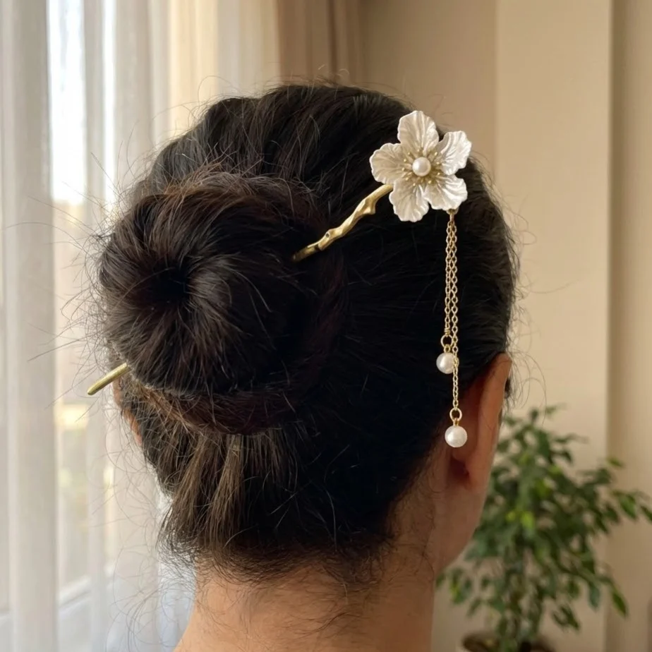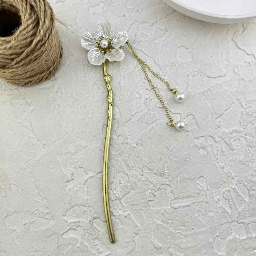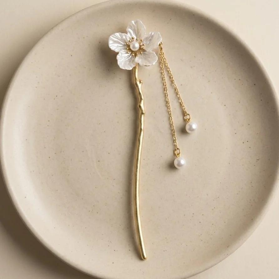 Floramina Metal Kanzashi Hair Stick with Mother-of-Pearl Flower & Pearl Dangle