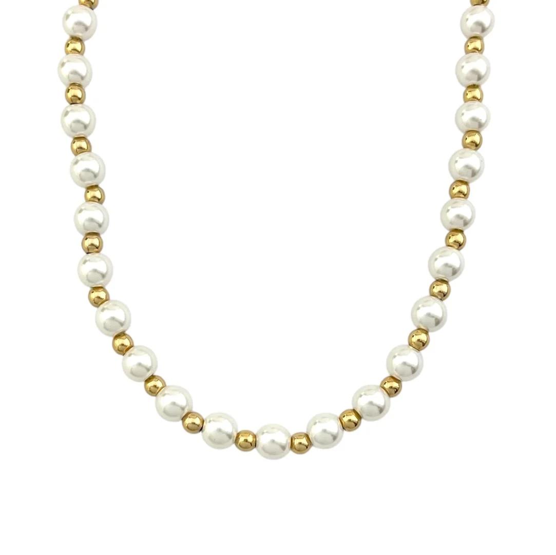 • جلوه درخشان: مرواریدهای براق و فینیش طلایی، جلوه‌ای لوکس و جذاب به گردنبند می‌بخشند.