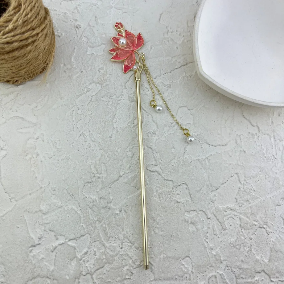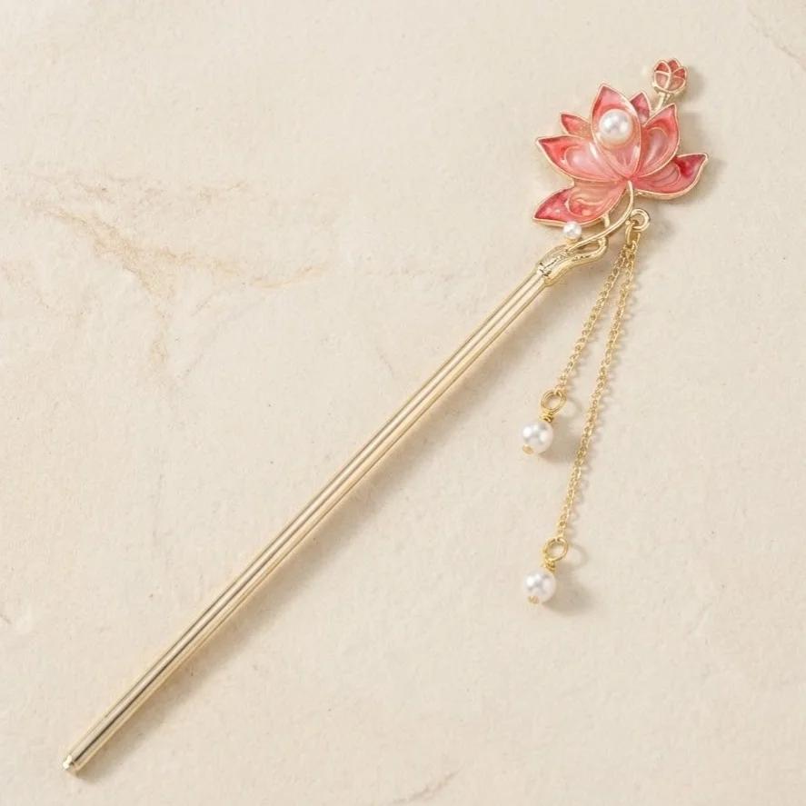 Florin Metal Kanzashi Hair Stick with Pink Lotus Flower & Pearl Dangles