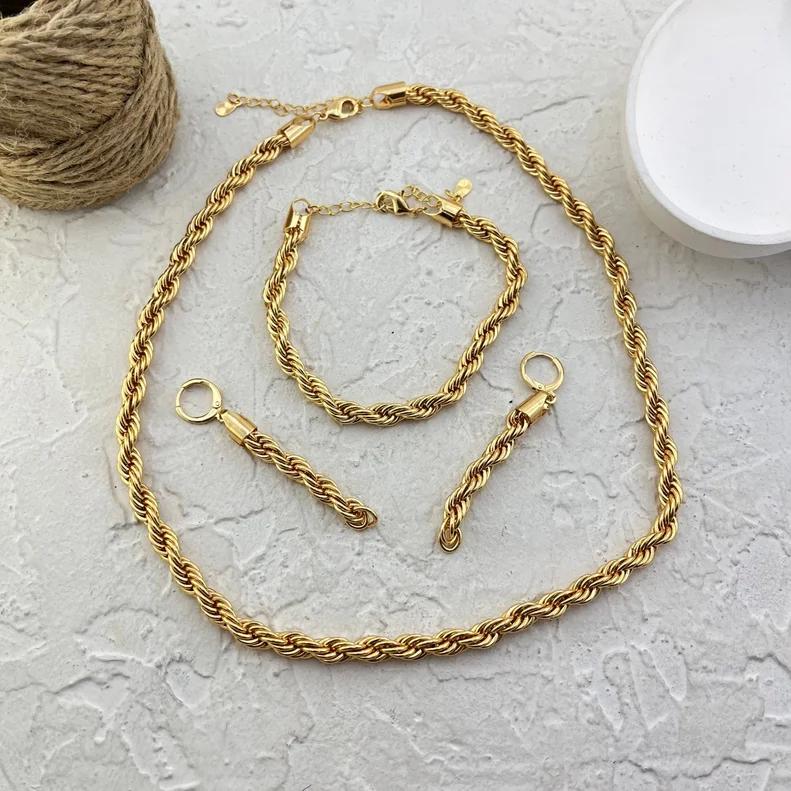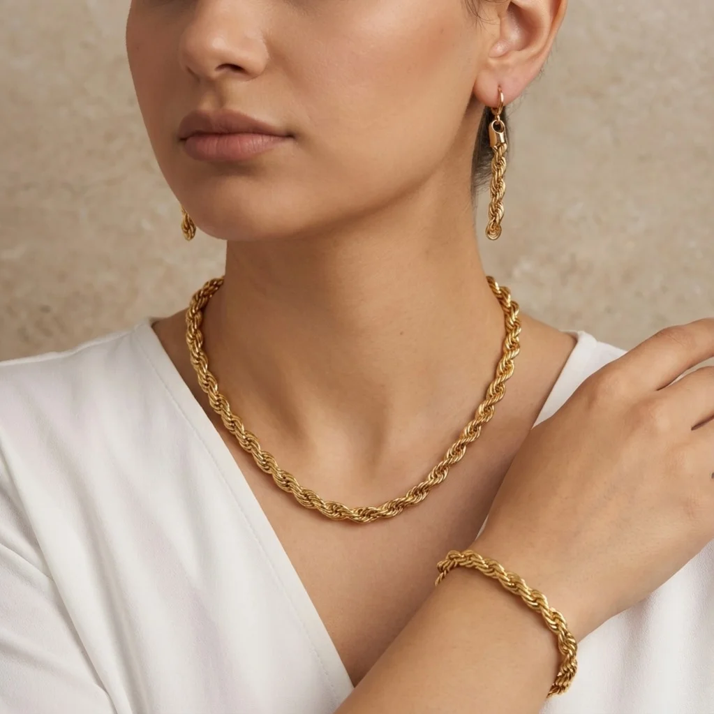 نیم‌ست زنانه مدل آئورلیا طرح طلا بافت طنابی (گردنبند، دستبند و گوشواره آویز)