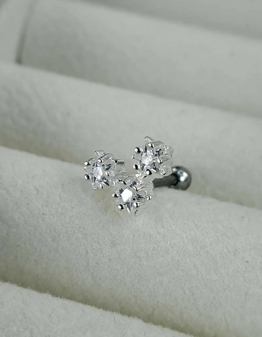 Silver ear stud piercing with multi-stone flower design