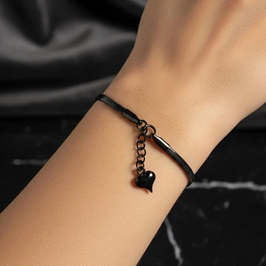 Snake Chain Bracelet with High-Quality Rhodium Plating and Black Heart Pendant