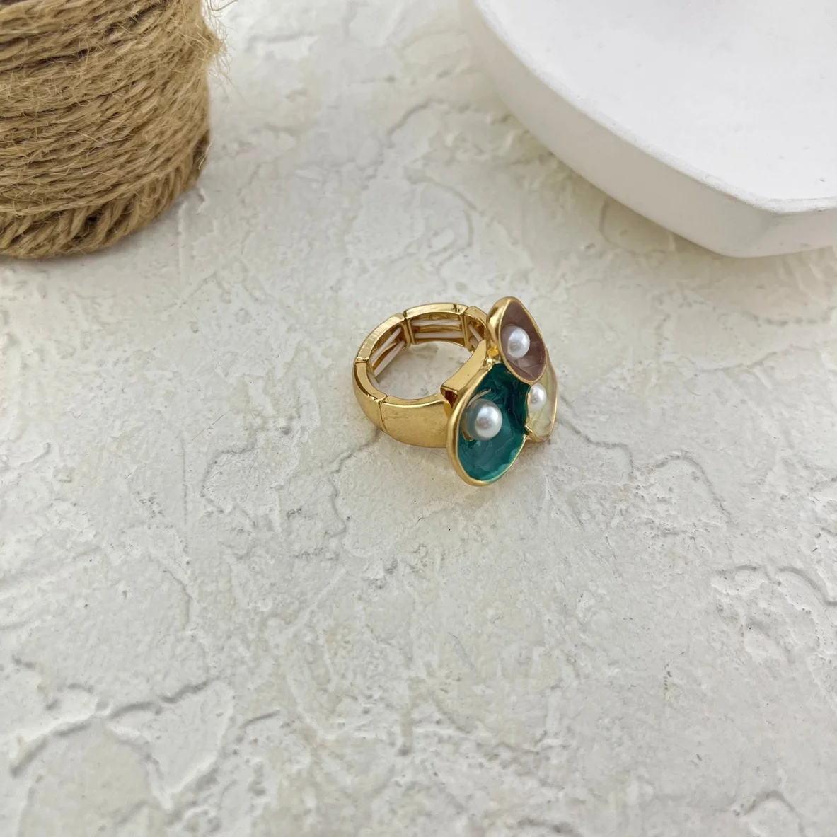 Women's Gold Tone Ring with Enamel and Pearl Design