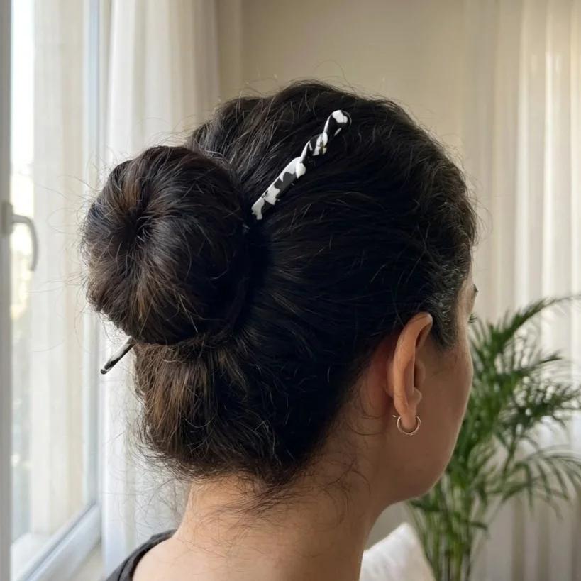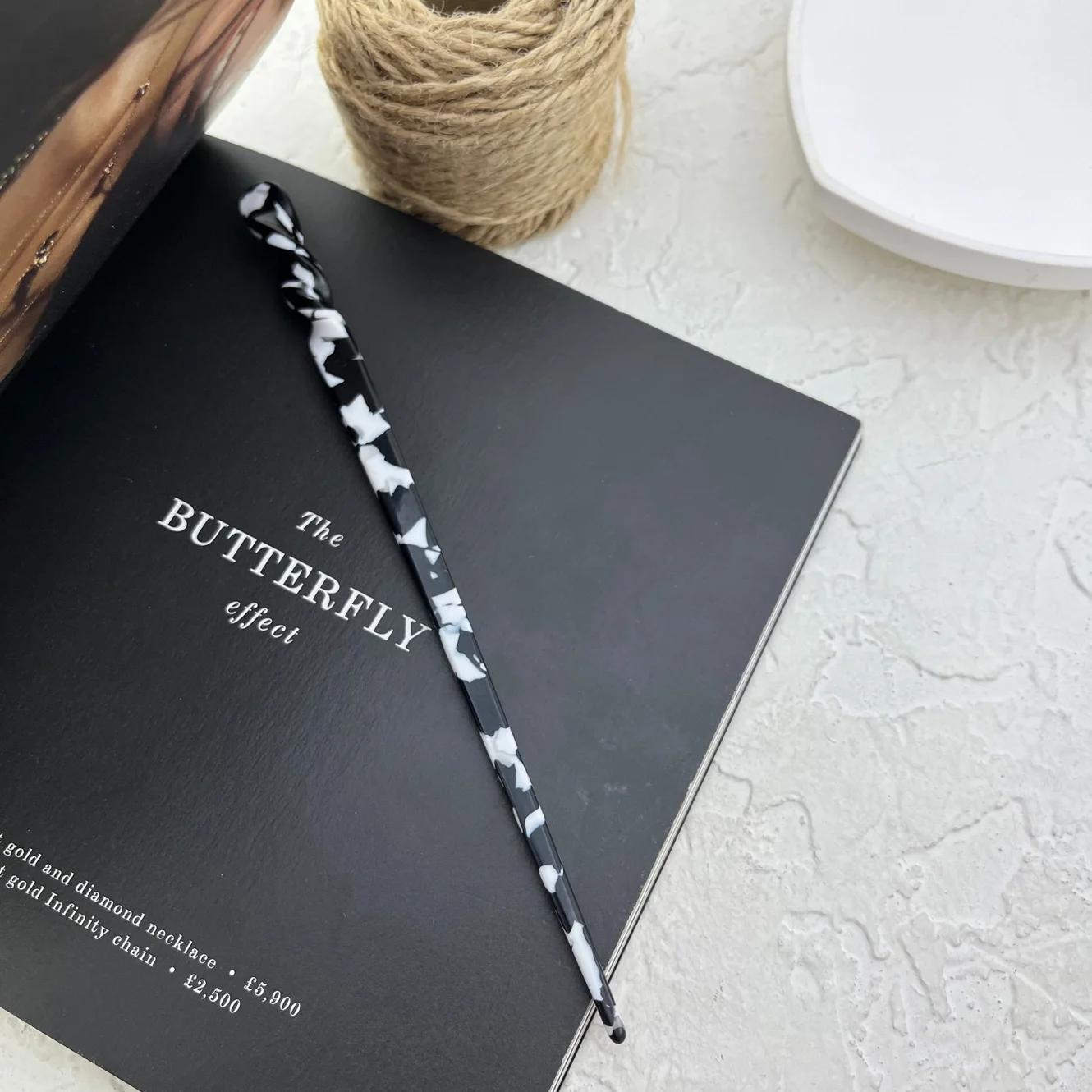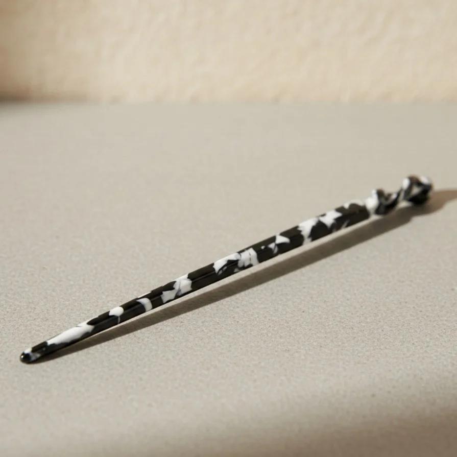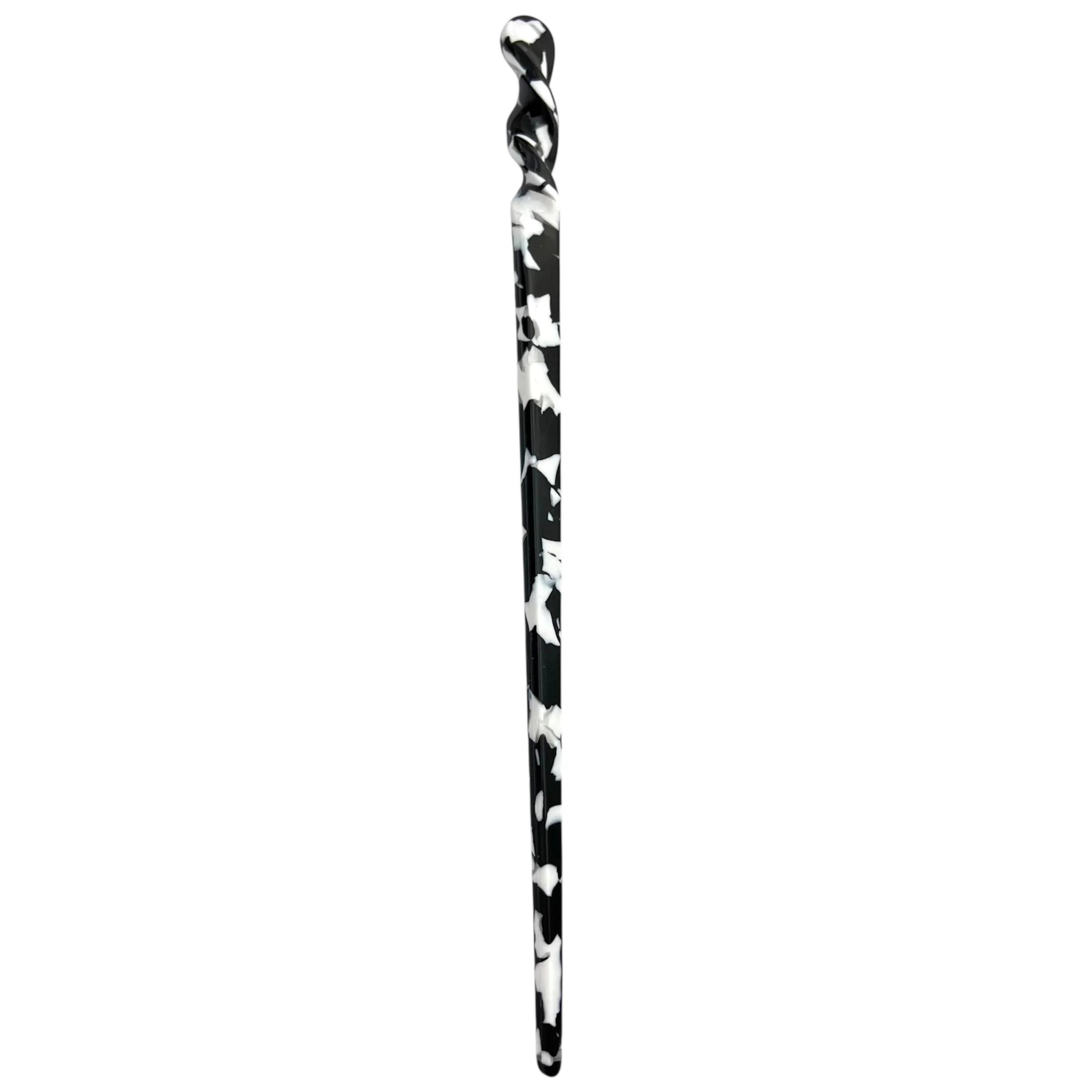 Women's Black-White Marbled Resin Twisted Kanzashi Hair Stick - Noir Model