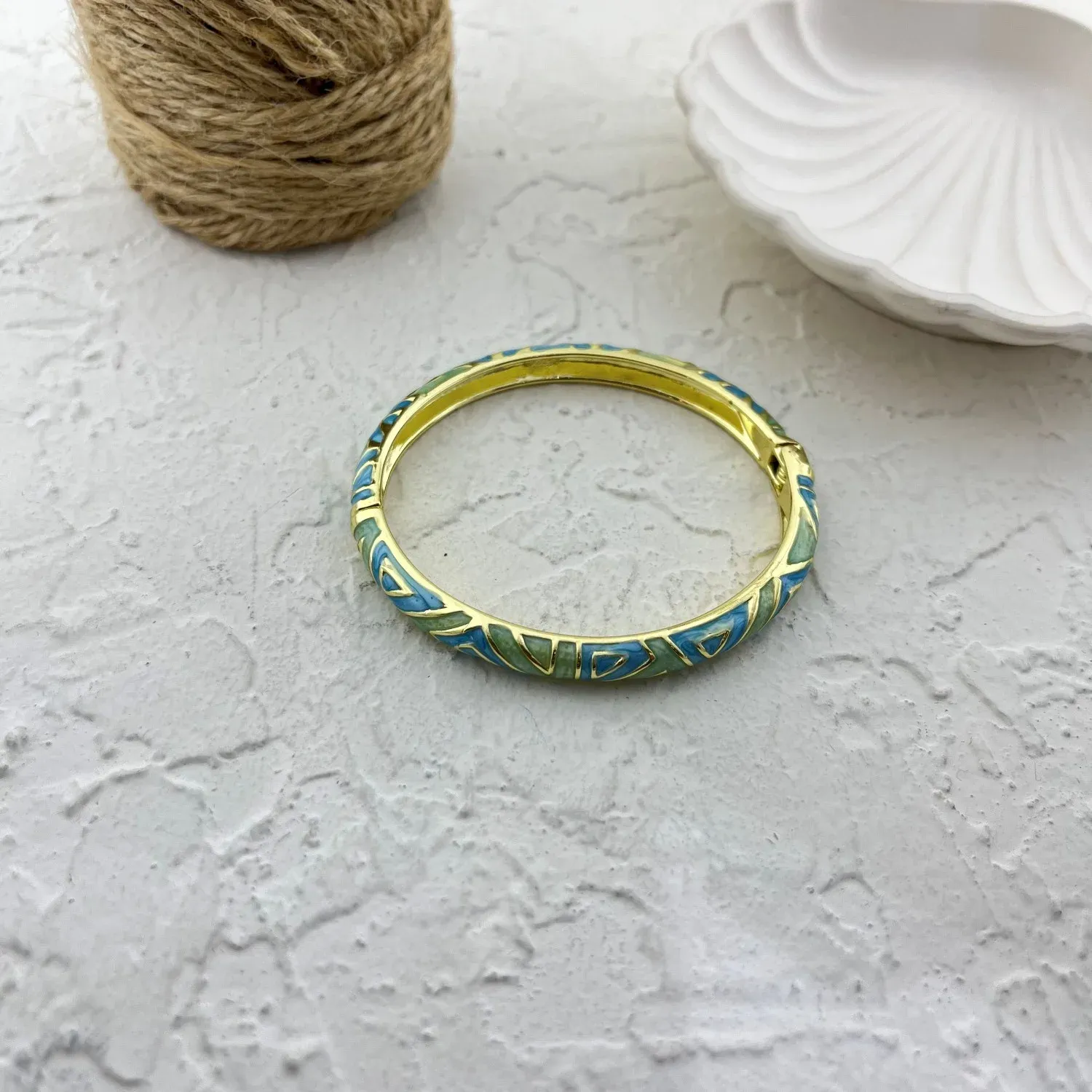 دستبند زنانه بنگل با طرح میناکاری سبز و آبی
